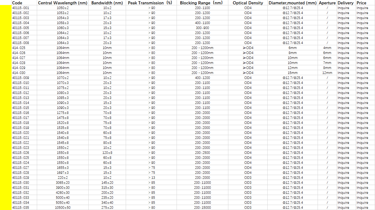The narrow bandpass filters on this page feature a wide transmission central wavelength range of 700-10500nm, from Ultra-Violet (UV) to Visible (VIS) spectrum, and various options of bandwidths. Dozens of mounted stock modules with a diameter range of 6-25.4mm, and hard coatings are for choosing. We also provide custom bandpass filters tailored upon request.